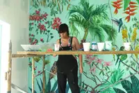 During the design phase led by conceptual designer Claudia Ruiz Vasquez, Boardwalk’s owners, twin sisters Kimberly and Stephanie Rooijakkers, were looking for stylish, possibly hand-painted wall paper, but could not quite find the right type for what they envisioned. Until one day they stumbled upon an Instagram post featuring tropical and exotic murals that were hand-painted by Mexican artist @tanagaxiola. This was no coincidence… this was a match! Just a few months later Tana Gaxiola and her husband Hector landed in Aruba and spent the next 6 weeks at Boardwalk Boutique Hotel creating 4 unique murals.