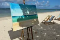 Today’s live painting marks the first part of a special twin art project. Suelyn is capturing the quiet beauty of sunrise at Boardwalk’s beach. She’ll return soon to the same spot to paint the sunset, creating a powerful day-to-night reflection through color, mood, and texture.