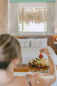 The Palapa Lodge keeps things beautifully simple with a mini-fridge, microwave, and kettle, perfect for island snacks and chilled rosé. A full kitchen and BBQ are not included. For meals, The Coco Café is just steps away and delivers breakfast directly to your balcony between 8:00 and 11:00 AM.